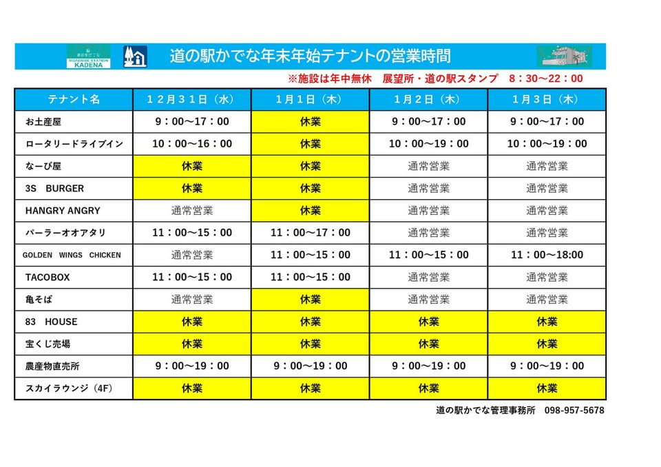 道の駅かでな年末年始のテナント営業時間についてお知らせです♪