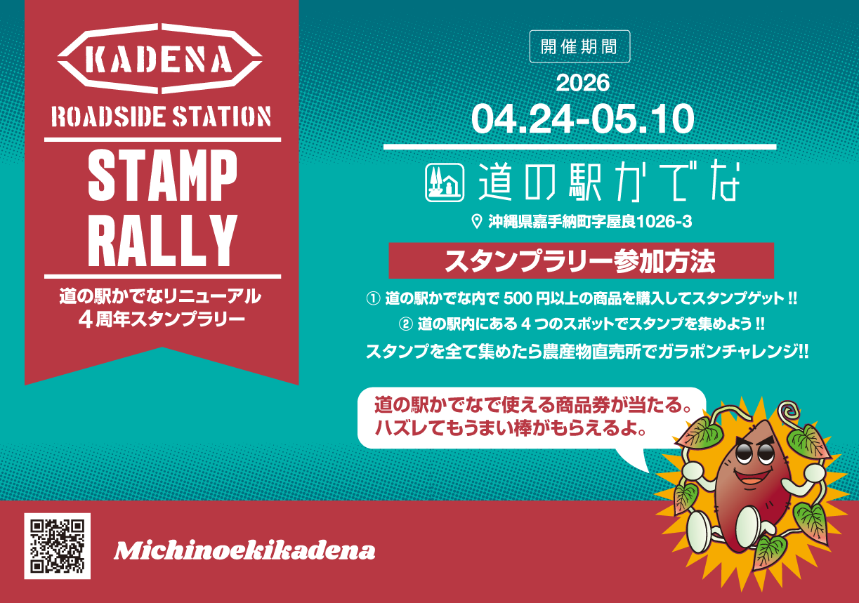 2026年4月24日(金)~5月10日(日)の期間 「道の駅かでな」の施設内でスタンプラリーを開催。 「道の駅かでな」で使える商品券が当たる!