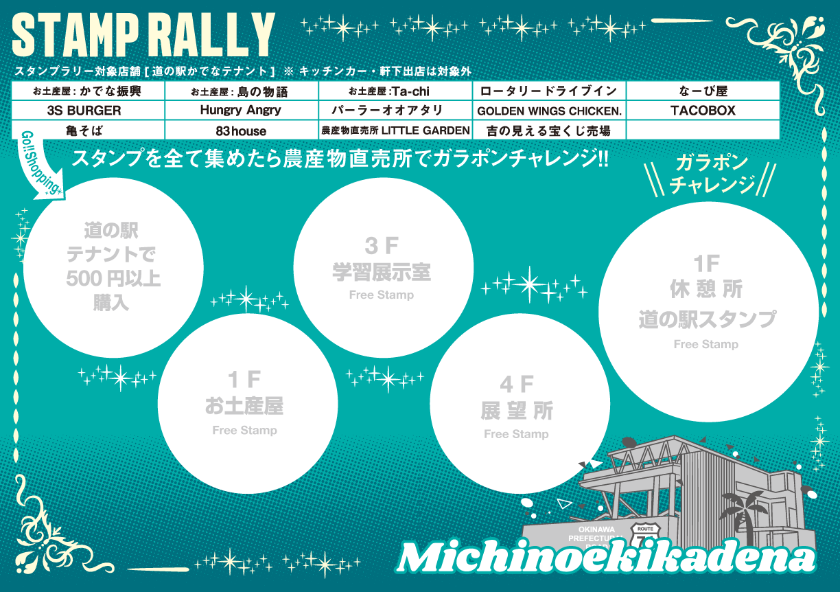 対象のテナントで「500円以上お買い上げで」1スタンプ。 その他 1階・3階・4階のフリースタンプ。 4つのスタンプを集めて1階の農産物直売所でガラポン抽選♪ 参加賞でうまい棒ご用意。 ※一部テナントと軒下出店はスタンプ対象外です。